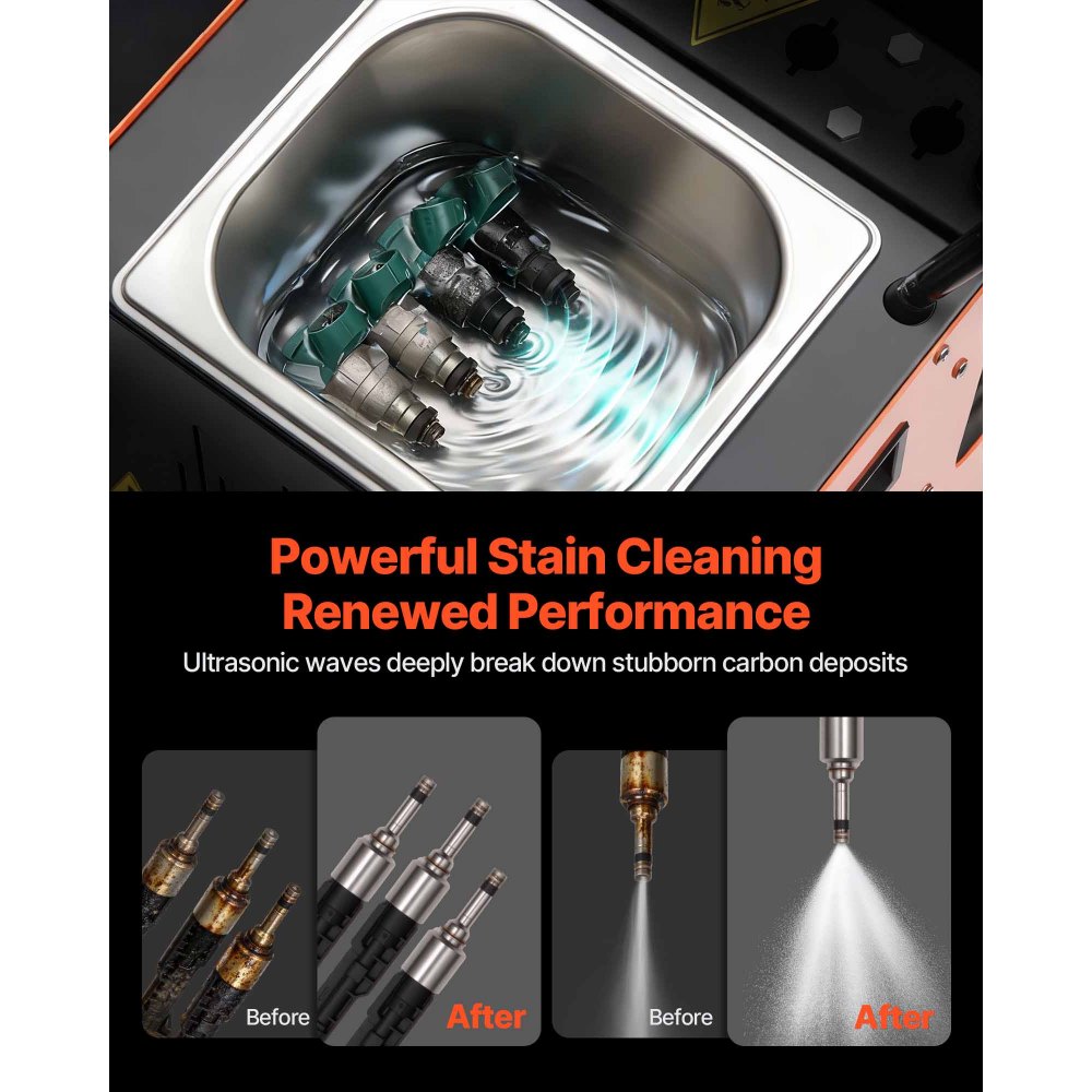 Limpiador de Inyectores 9 Modos de Prueba 3 Modos de Limpieza, Máquina de Limpieza Ultrasónica de 4 Cilindros y 28 kHz, con Válvula de Drenaje y Voltaje de 12 V para Automóviles y Motocicletas