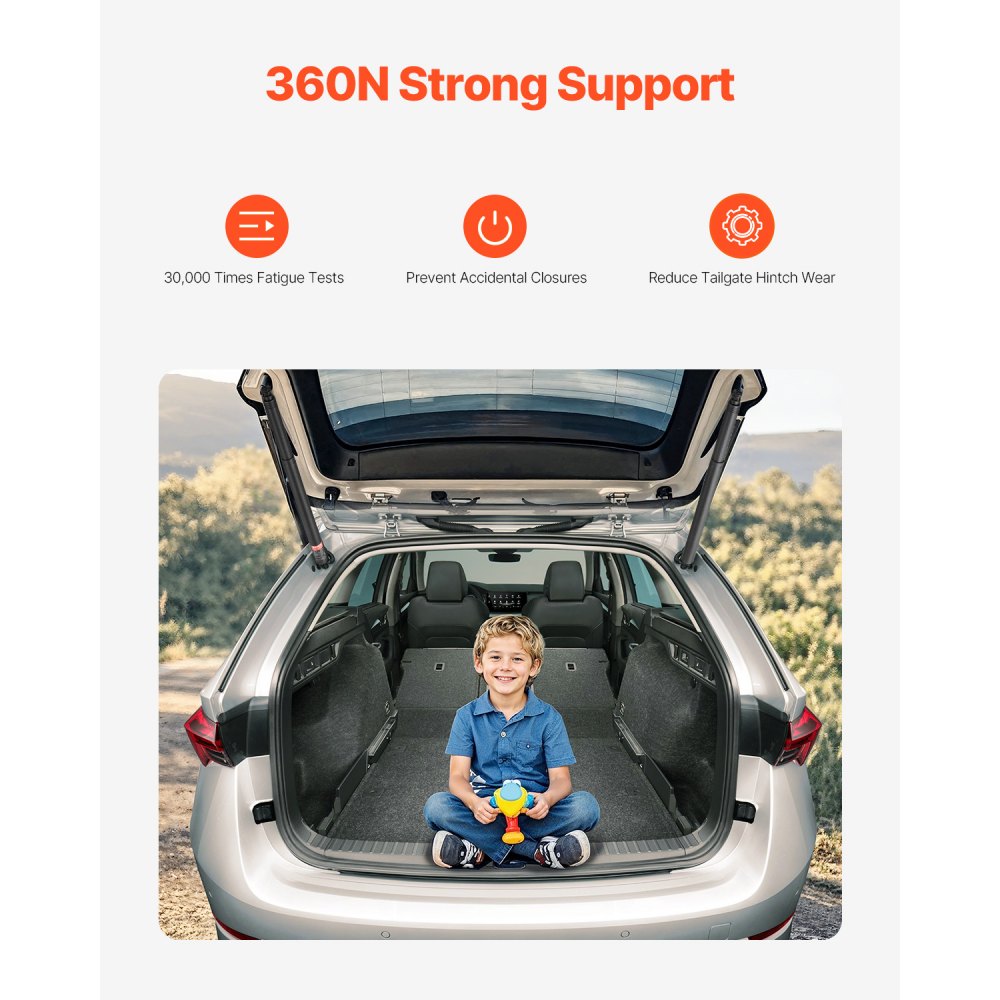 Fuerte soporte: Con una poderosa fuerza de soporte de 360 N, nuestros puntales de choque de soporte de elevación eléctrica del portón trasero abren y cierran el portón trasero de manera suave y segura en 5 a 8 segundos, lo que reduce el desgaste de las bisagras, y el puntal del portón trasero ha pasado 30,000 pruebas de fatiga para mayor seguridad