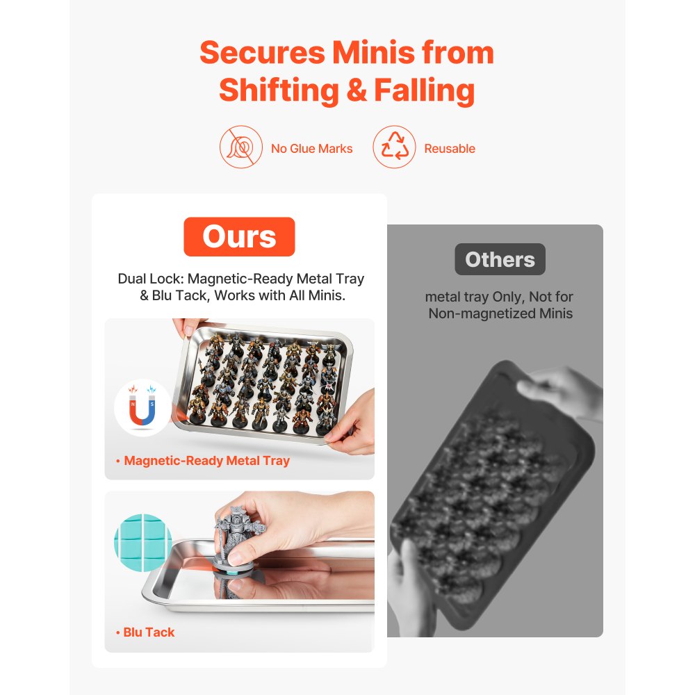 Doble sujeción: Este estuche de transporte en miniatura utiliza bandejas magnéticas deslizantes de acero al carbono y masilla reutilizable para pósteres. Se puede sujetar las miniaturas con un agarre firme y estable durante el transporte