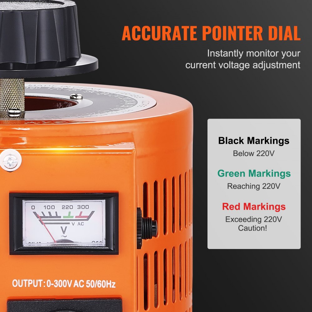 Precisión al alcance de su mano: nuestro transformador de voltaje variable está equipado con un dial analógico, lo que le permite monitorear fácilmente el voltaje de salida actual de un vistazo. Ajuste la tensión sin esfuerzo con una perilla montada en la parte superior diseñada para brindar comodidad y flexibilidad. La placa de escala de metal presenta marcas claras y fácilmente legibles, lo que le permite marcar rápidamente el voltaje exacto que necesita.