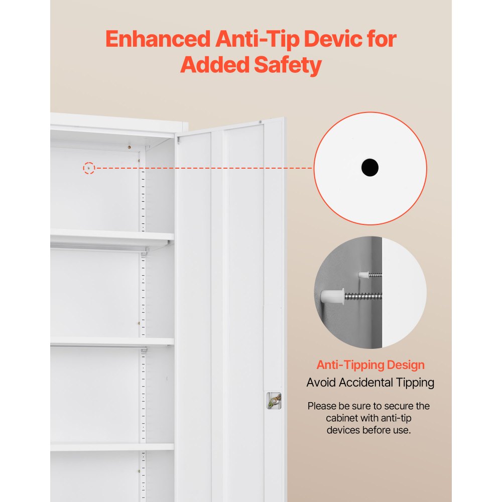 Seguridad para montaje en pared: La parte trasera de este armario de almacenamiento de acero incluye orificios de montaje para una instalación segura en la pared. Instale siempre el kit antivuelco antes de usarlo, especialmente cerca de niños o en superficies irregulares, para mayor estabilidad