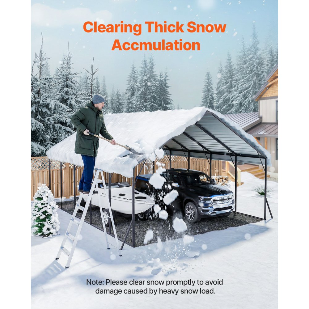 Techo duradero: El techo está hecho de acero galvanizado, lo que ofrece una protección duradera. Incluye cinta selladora de alta densidad mejorada para evitar filtraciones de lluvia en los paneles del techo, lo que proporciona una protección excepcional contra la intemperie. El garaje soporta hasta 35 lbs/ft², protegiendo sus vehículos y equipos de las inclemencias del tiempo
