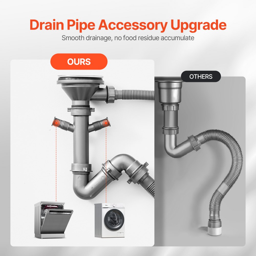 Sistema de drenaje rápido: Este fregadero de barra de preparación cuenta con un diseño de drenaje en forma de X en la parte inferior, equipado con un kit de drenaje para garantizar un drenaje rápido y evitar la acumulación de agua. También incluye una abertura de drenaje lateral y dos interfaces de tubería de agua para conectar lavavajillas, lo que permite un drenaje suave sin acumulación de residuos de alimentos.