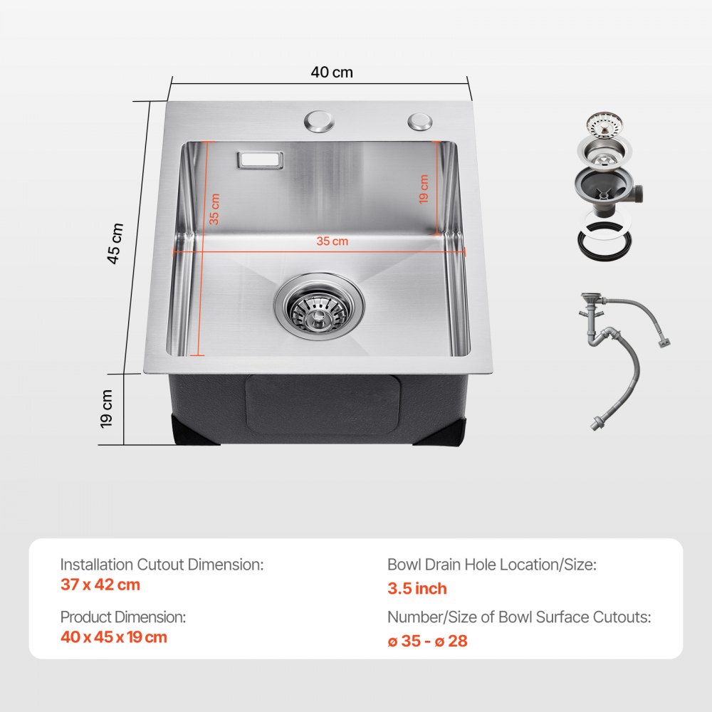 Gran capacidad: Dimensión externa del fregadero: 40 x 45 cm. Dimensión interna: 37 x 42 cm. Profundidad del cuenco: 19 cm. Este fregadero de cocina es lo suficientemente profundo como para acomodar tazas, ollas y bandejas para hornear, satisfaciendo diversas necesidades de lavado.