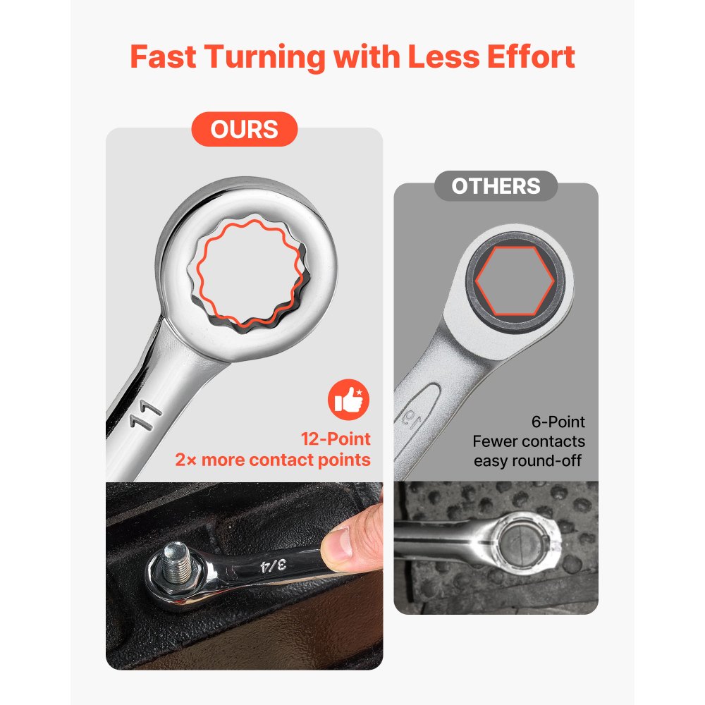 Agarre estable con extremo de 12 puntas: El extremo de estrella de 12 puntas mejora el contacto con los sujetadores para reducir el deslizamiento y el desgaste al apretar o aflojar. Este juego de llaves combinadas garantiza un giro suave y un mejor control, incluso con tuercas desgastadas o parcialmente redondeadas