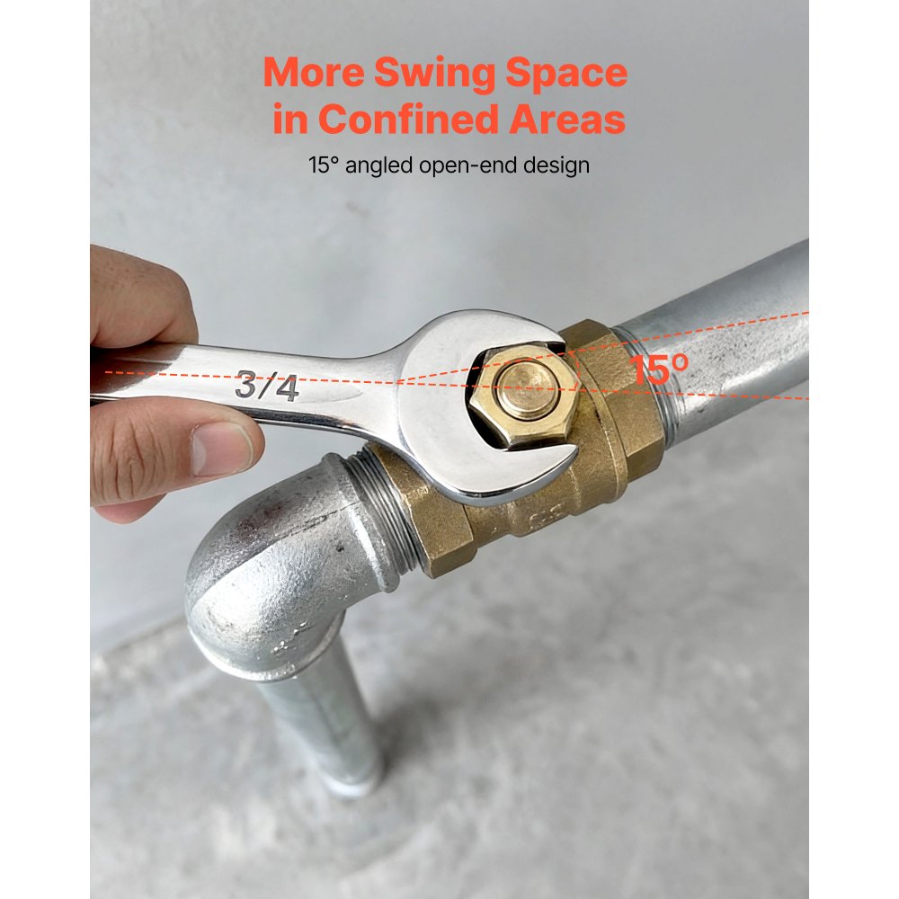 Boca abierta en ángulo de 15° para un mejor acceso: El extremo abierto de 15° proporciona mayor espacio para las manos, facilitando el giro en espacios reducidos o difíciles. Nuestras llaves combinadas se crean un espacio de giro donde las llaves planas no pueden moverse libremente, lo que mejora la comodidad y la eficiencia