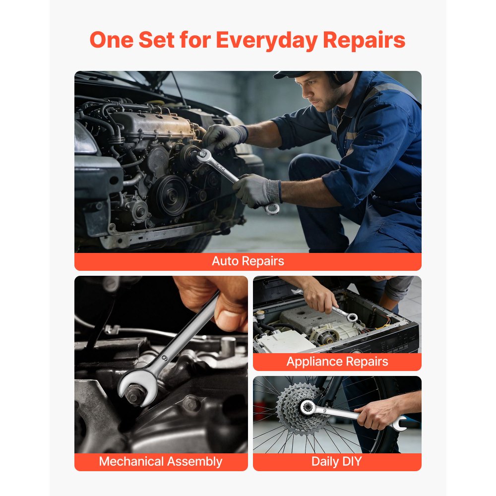 Amplia gama de tamaño: El juego de llaves combinadas incluye tamaños SAE y métricos que se utilizan habitualmente en la reparación de automóviles, el montaje mecánico, el mantenimiento de electrodomésticos y los proyectos de bricolaje. Seleccione el tamaño adecuado para el trabajo y trabaja de forma más eficiente