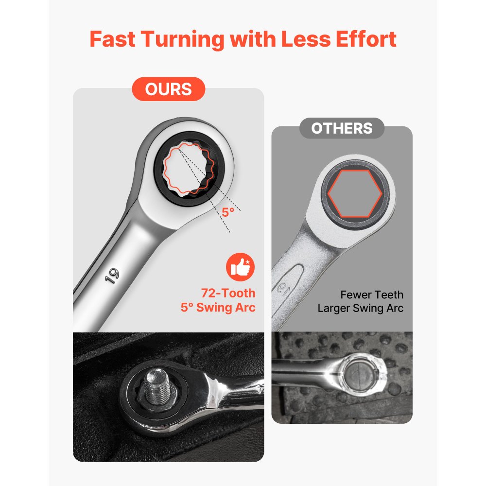 Giro suave para un trabajo rápido: La carraca de 72 dientes y el diseño de microoscilación de 5° reducen el movimiento de la mano para un control suave en espacios reducidos. Este juego de llaves de carraca cuenta con un agarre antideslizante y un engranaje preciso para un giro más fácil e ininterrumpido