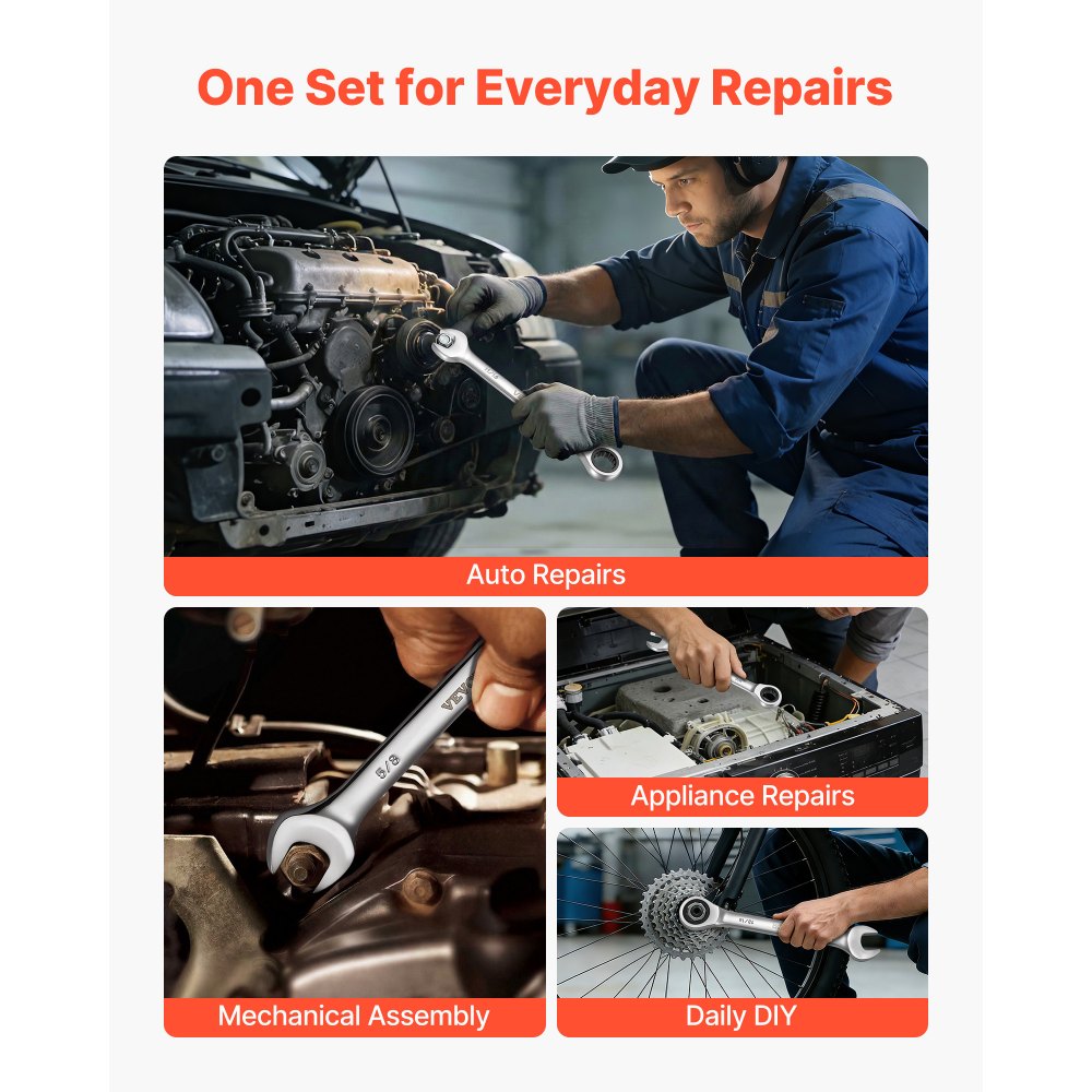 Diseñado para un uso diario duradero: Este juego de llaves de trinquete está fabricado con un cuerpo de acero reforzado y una cabeza de trinquete de acero cromo vanadio para mayor resistencia y fiabilidad. El acabado antioxidante garantiza un rendimiento fiable incluso en entornos húmedos o aceitosos