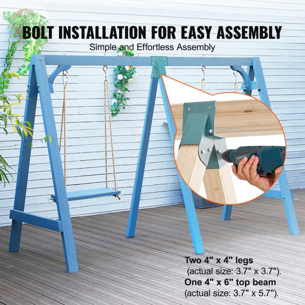 Soporte seguro: La estructura triangular en forma de A del marco del columpio proporciona un soporte estable y sin oscilaciones, lo que garantiza la seguridad de los niños durante el juego. Se recomienda utilizar dos patas de 4" x 4" x 96"/10,2 x 10,2 x 244 cm (tamaño real 3,7" x 3,7"/94 x 94 mm) y una viga superior de 4" x 6" x 114"/10,2 x 15,2 x 290 cm (tamaño real 3,7" x 5,7"/94 x 145 mm).