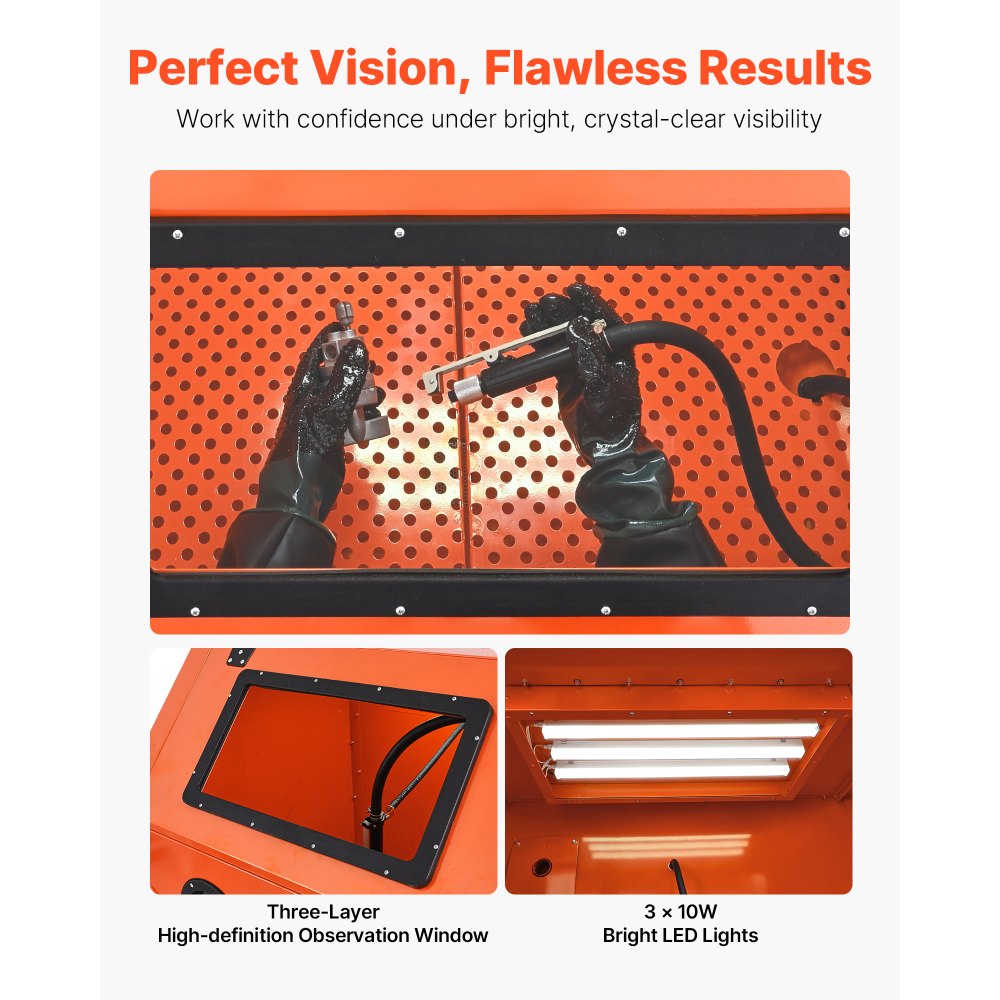Espaciosa para piezas de gran tamaño y construcción duradera: Aborde proyectos de gran tamaño con facilidad gracias a su amplio interior de 115 x 91 x 90 cm. Fabricada con acero laminado en frío de alta resistencia, esta cabina de arenado está diseñada para soportar las exigencias del uso diario en el taller