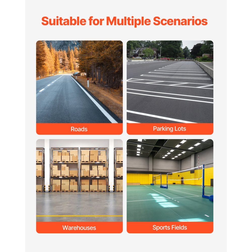 Adecuado para múltiples escenarios: Esta máquina de marcado de líneas de alta resistencia se puede utilizar en estacionamientos, almacenes, campos deportivos y más. Es adecuada para diversos materiales de suelo, como asfalto, hormigón y césped. El diseño plegable hace que sea más fácil de transportar y almacenar