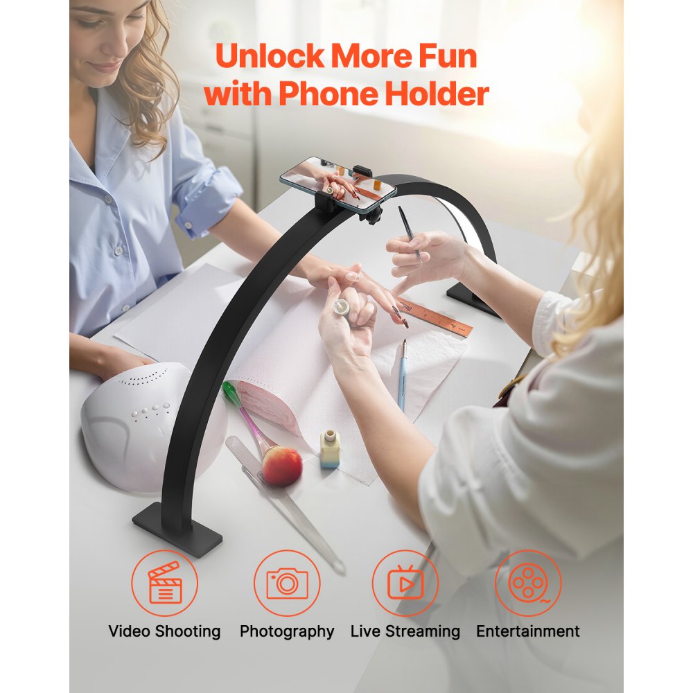 Lámpara Arqueada de Escritorio para Uñas, 30 W Lámpara LED en Forma de Media Luna con Soporte para Teléfono, Brillo y Temperatura de Color Ajustables, para Belleza, Extensiones de Pestañas