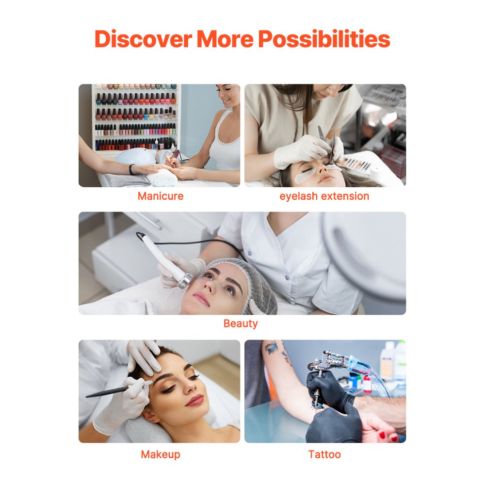 Iluminación integral: La lámpara de escritorio en forma de media luna proporciona una iluminación más uniforme, lo que minimiza las sombras y el deslumbramiento. Garantiza una visión clara y sin distorsiones durante cualquier tratamiento de belleza o de uñas, lo que proporciona una visibilidad óptima para trabajos de precisión