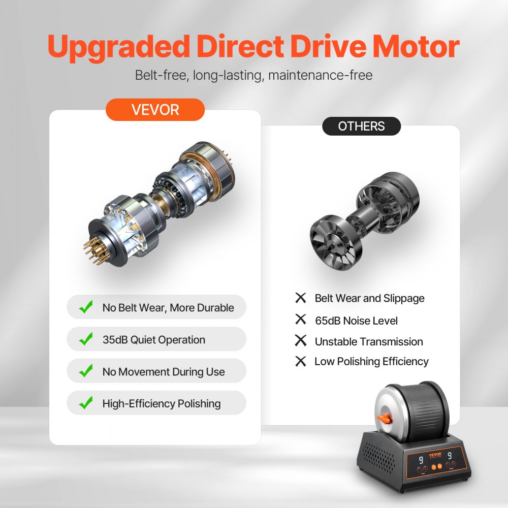 Motor de transmisión directa sin correa: ¡No más preocupaciones por correas rotas! El motor de transmisión directa ofrece potencia eficiente con un funcionamiento silencioso de 35 dB. La pulidora de rocas funciona a baja temperatura incluso después de un uso prolongado, lo que garantiza una vida útil más larga para una diversión sin fin.