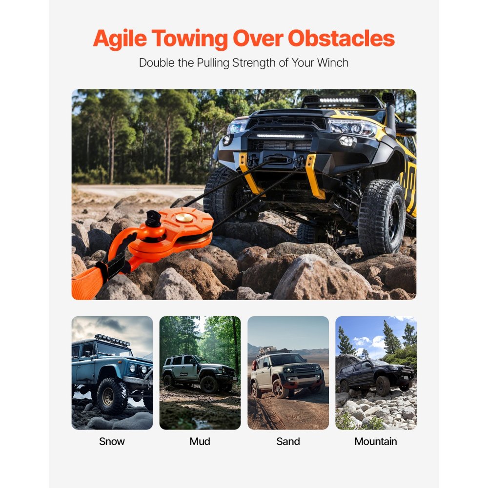 Doble potencia de tracción: Esta polea de arrastre con gancho duplica la potencia de tracción del cabrestante, reduce la tensión en el cabrestante y maximiza su resistencia. Cambie la dirección de la fuerza con facilidad, lo que facilita sacar su vehículo de terrenos difíciles como nieve, barro, arena y hielo