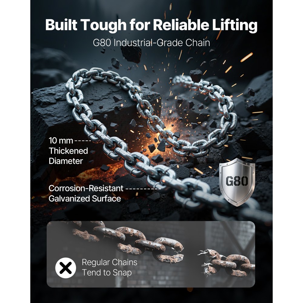 Cadena Industrial G80: El polipasto de cadena incorpora una cadena de aleación G80 galvanizada de 6 m de longitud y 10 mm de grosor, resistente a la corrosión. Robusta y duradera para aplicaciones exigentes, garantiza una elevación fiable en construcción, almacenes y aplicaciones industriales