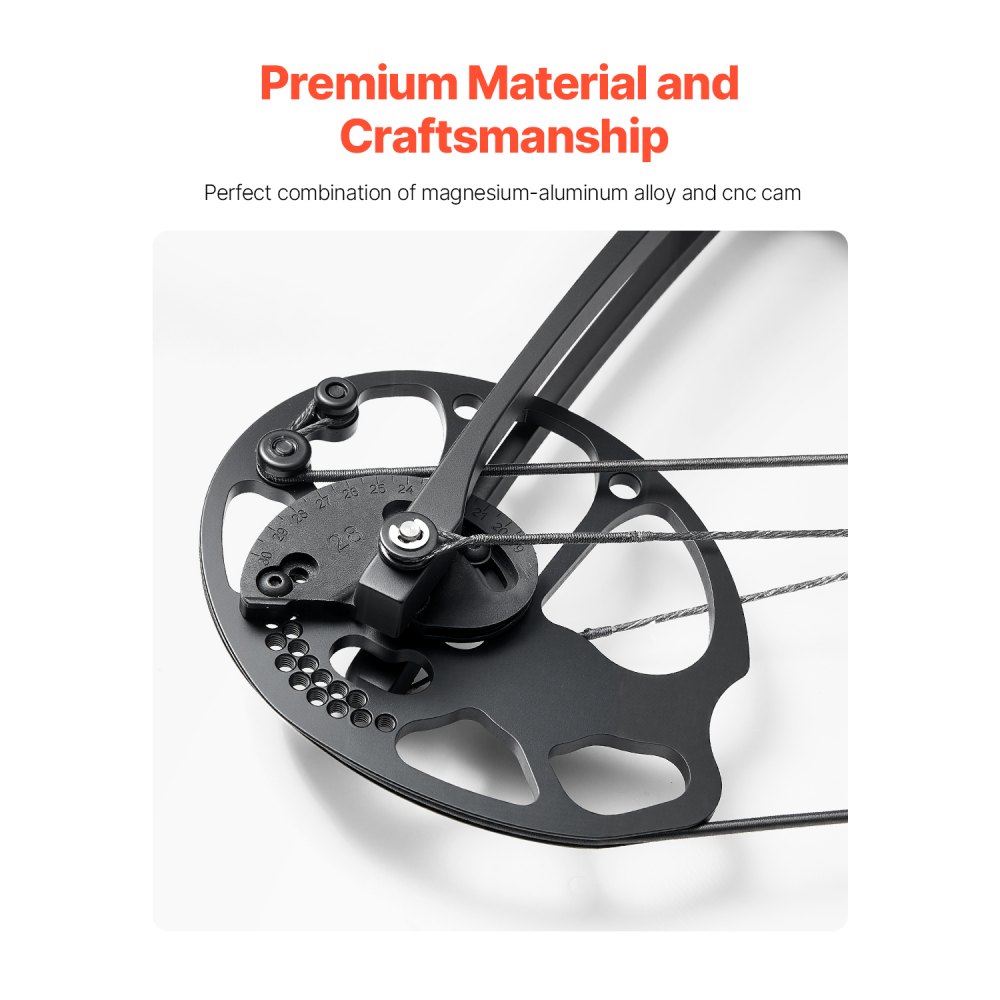 Material premium y duradero: El arco compuesto está fabricado con una combinación de aleación de magnesio y aluminio y materiales de leva CNC, lo que lo hace robusto y resistente al desgaste. El arco es fácil de tensar y mantiene un rendimiento excelente