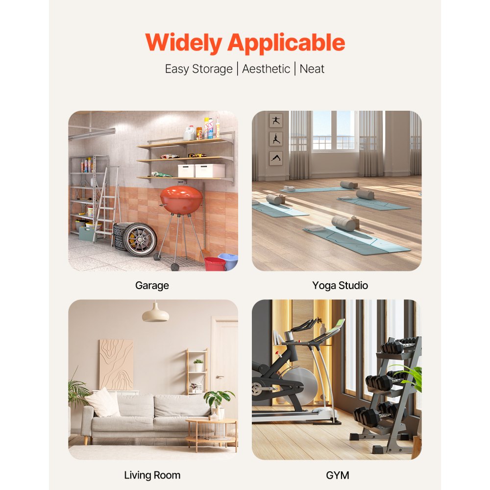 Material resistente y duradero: Este organizador de almacenamiento de equipo de entrenamiento está hecho de acero con recubrimiento en polvo de alta calidad para el marco y tubos engrosados, lo que garantiza durabilidad y resistencia al desgaste durante años de uso. El soporte puede soportar hasta 160 libras, lo que proporciona soluciones de almacenamiento duraderas. Las ranuras antideslizantes para mancuernas están diseñadas para evitar el riesgo de que las pesas se caigan