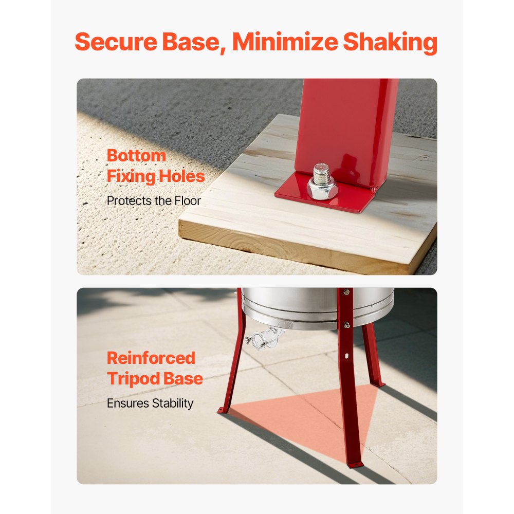 Estabilidad y altura ajustable: Con una estructura triangular de 3 patas, este extractor de panal ofrece mayor estabilidad. La altura se ajusta de 30 a 40 cm para adaptarse a las necesidades de cada usuario