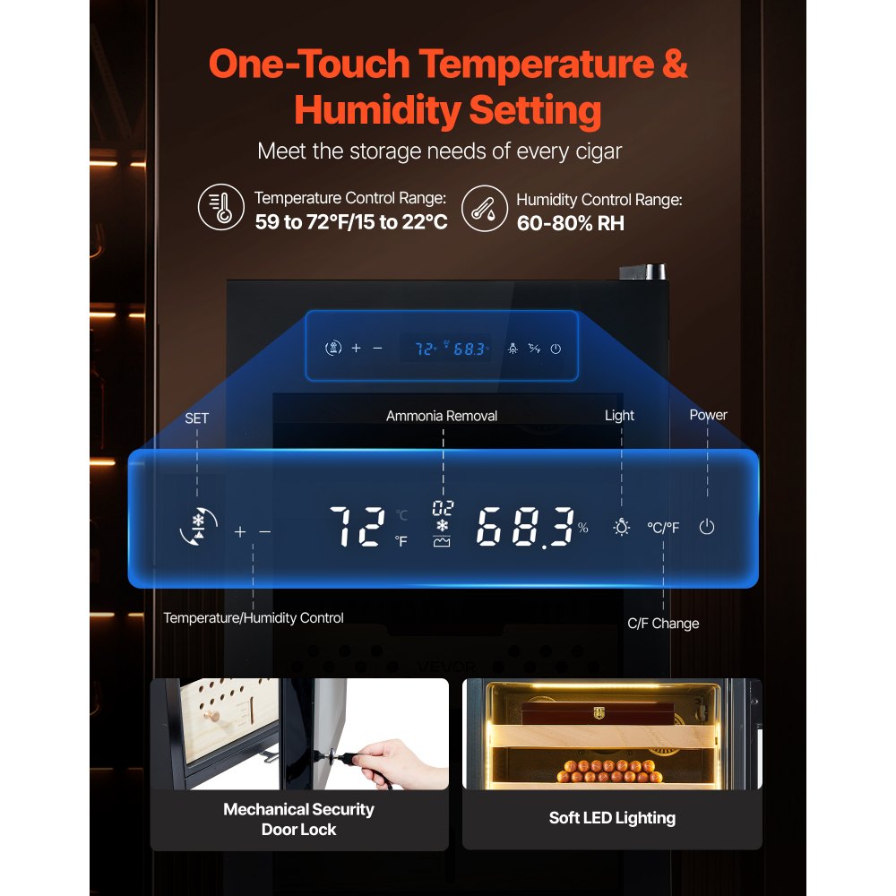 Ajustes con un solo toque: Equipado con una pantalla táctil, este humidor eléctrico permite ajustar fácilmente la temperatura 15-22 °C y la humedad 60-80 % de humedad relativa. Cuenta con cerradura mecánica en la puerta e iluminación LED suave para un control sencillo