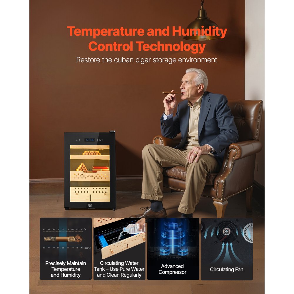 Temperatura y humedad constantes: Equipado con un tanque de agua circulante, un compresor de alto rendimiento y un ventilador circulante, nuestro humidor de puros eléctrico distribuye uniformemente el aire cálido y frío, lo que garantiza una conservación óptima de sus puros