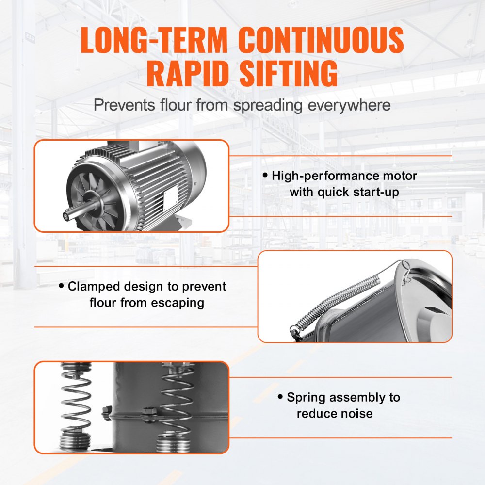 Tamizado de alta eficiencia: equipado con un motor de alto rendimiento que arranca rápidamente y puede funcionar de forma continua durante largos períodos, lo que proporciona un tamizado rápido. El conjunto de resortes superior reduce eficazmente el ruido y garantiza un funcionamiento estable y sin vibraciones. Con un sellado fuerte, el polvo no vuela y los líquidos no se filtran, lo que lo hace adecuado para tamizar polvos alimenticios, polvos de medicina tradicional china, líquidos, productos químicos y más.