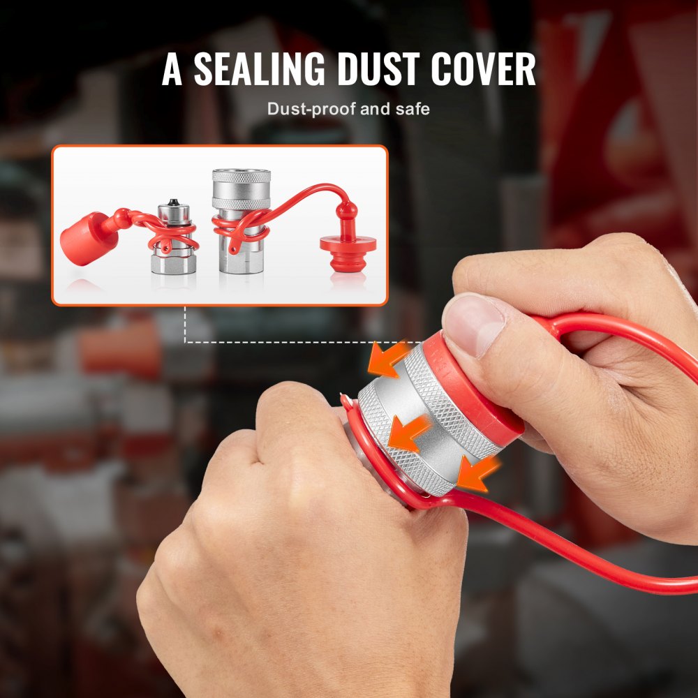Tapones antipolvo con sello: viene con tapones antipolvo para evitar que la suciedad dañe el sistema de conexión, reducir el riesgo de fallas y mantener limpios los acopladores hidráulicos del minicargador cuando no están en uso. Los sellos antipolvo internos también garantizan que el sistema de bloqueo del manguito funcione suavemente y sin interferencias.