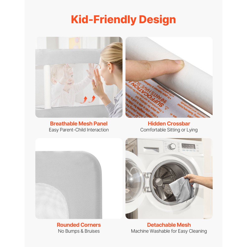 Desmontable y lavable: El panel de malla de la barandilla de la cama para niños pequeños se desprende para facilitar la limpieza y se puede lavar a máquina, lo que hace que sea fácil mantener frescas las barandillas laterales de la cama