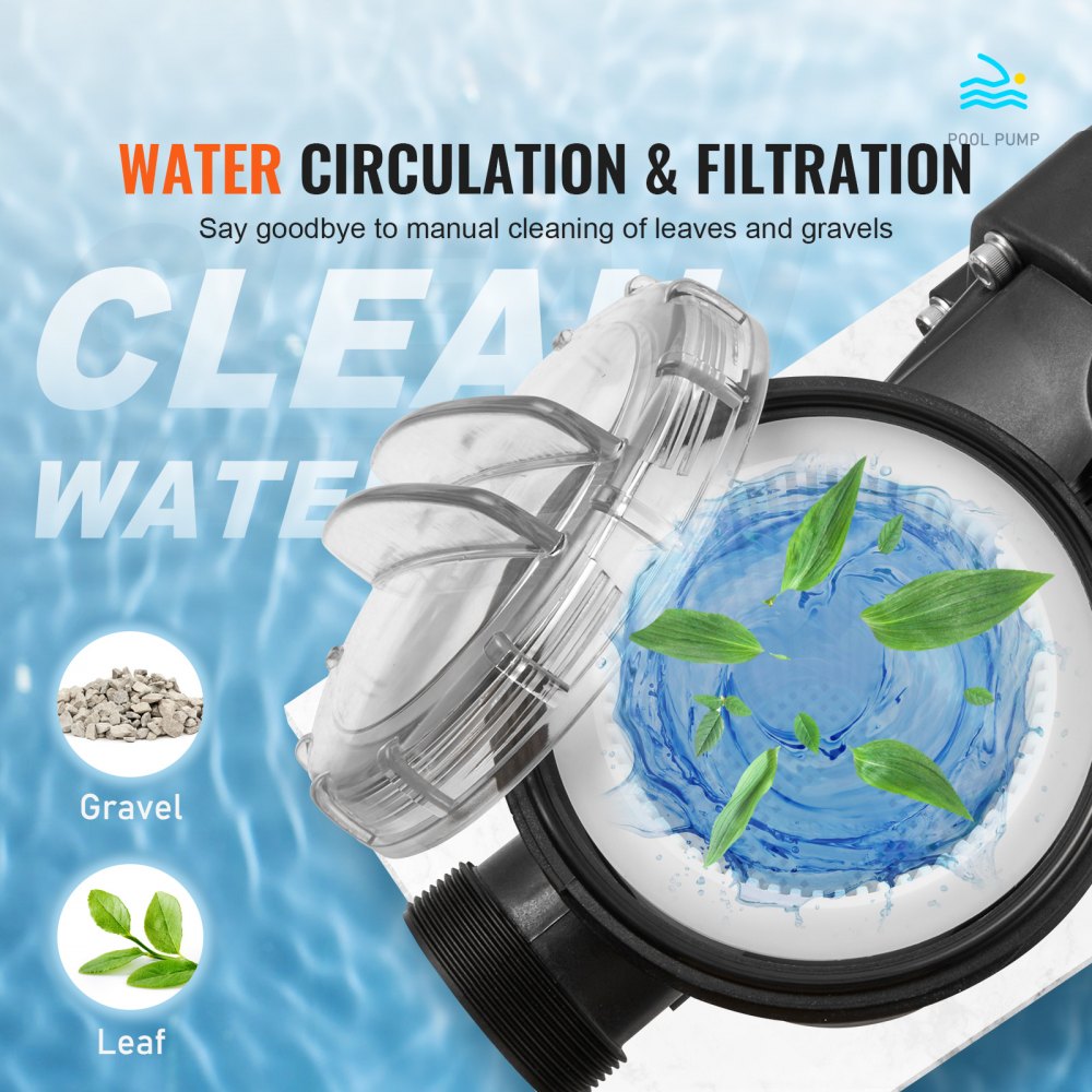 Sistema de circulación de agua eficiente: Con un caudal máximo de 100 GPM. Caudal de agua y 15 m con la cabeza elevada, nuestra bomba para piscina garantiza una rápida circulación del agua. Su cesta filtrante extraíble, compatible con filtro de arena (no incluido), facilita la depuración física y mantiene el agua de tu piscina cristalina.