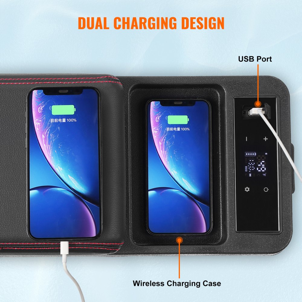 Frigorífico para coche con reposabrazos: El frigorífico para coche está equipado con función de carga dual, conexión USB y carga inalámbrica de teléfono. El mango de cuero es de calidad y se puede utilizar en su automóvil, lo que le permitirá disfrutar más del viaje.