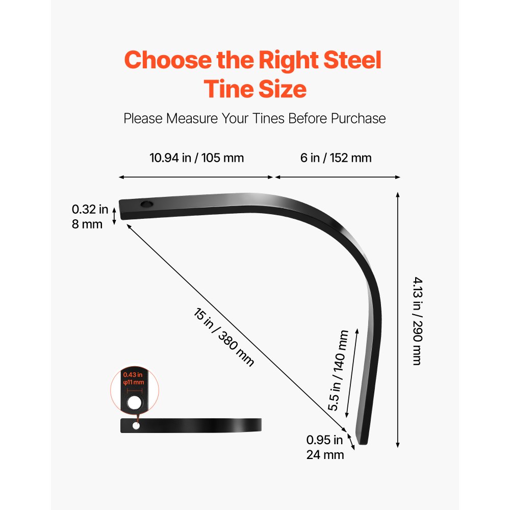 Elegir el tamaño adecuado: Cada diente de repuesto para rastrillo de tractor mide 278x240x24 mm (10,94x9,45x0,94 pulgadas), con un grosor de 8 mm (0,32 pulgada) y un orificio de montaje de 11 mm (0,43 pulgada). Por favor confirme la compatibilidad y el tamaño requerido antes de comprar