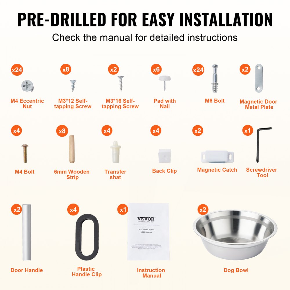 Lo que obtienes: Cuenco para perros x 2, tornillo autorroscante M3 x 8, perno M6 x 24, tuerca excéntrica M4 x 24, tornillo M4 x 4, manija negra x 2 pares, manija de puerta x 2, tira de madera x 8, almohadilla con clavo x 4, cierre magnético x 2 juegos, manual de instrucciones x 1
