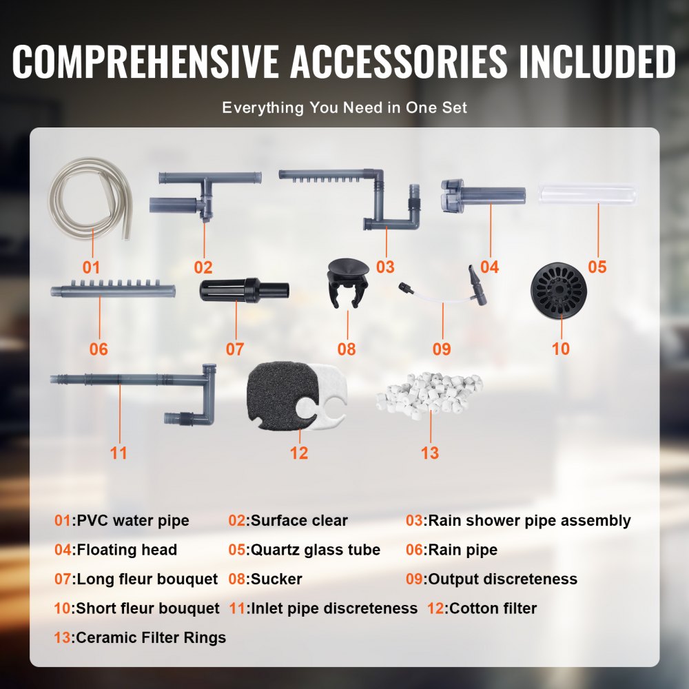Filtración eficiente: la bomba incorporada tiene un caudal máximo de 225 GPH (850 L/H) con una potencia de 10 W, recomendada para su uso en acuarios de agua dulce de 55 galones, acuarios de tortugas y acuarios de peces. El agua fluye a través de las capas del medio para filtrar el agua y garantizar una condición acuática limpia. Cada pañal tiene una esponja para mantenerlo en su lugar y viene con anillos de cerámica y bioperlas.