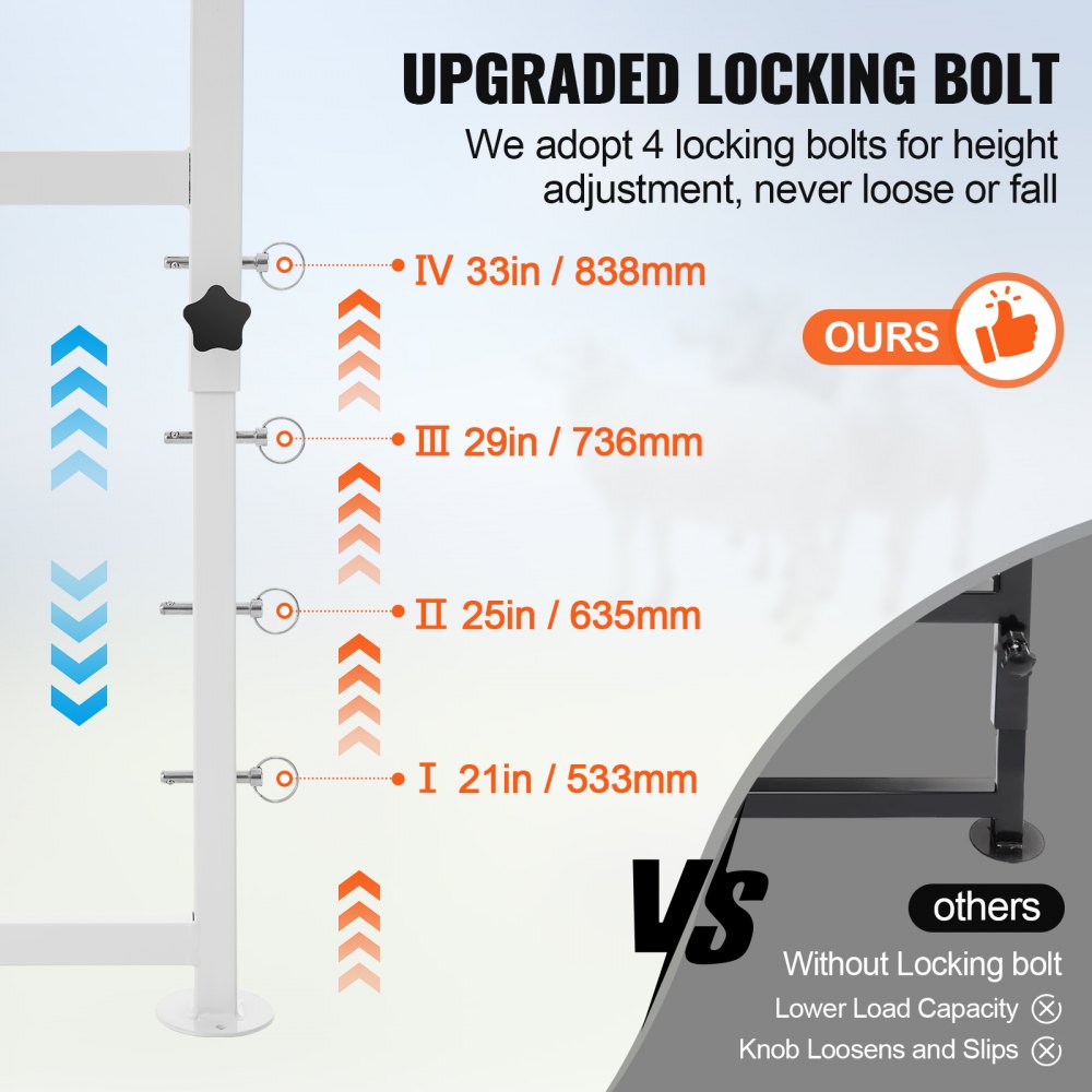 Altura ajustable de 4 niveles: con un diseño de pasador único, nuestro soporte para cabras ofrece cuatro configuraciones de altura que van desde 21" a 33", acomodando animales de diferentes tamaños. Los montantes reforzados con un marco triangular brindan mayor estabilidad y soporte, mejorando la seguridad.