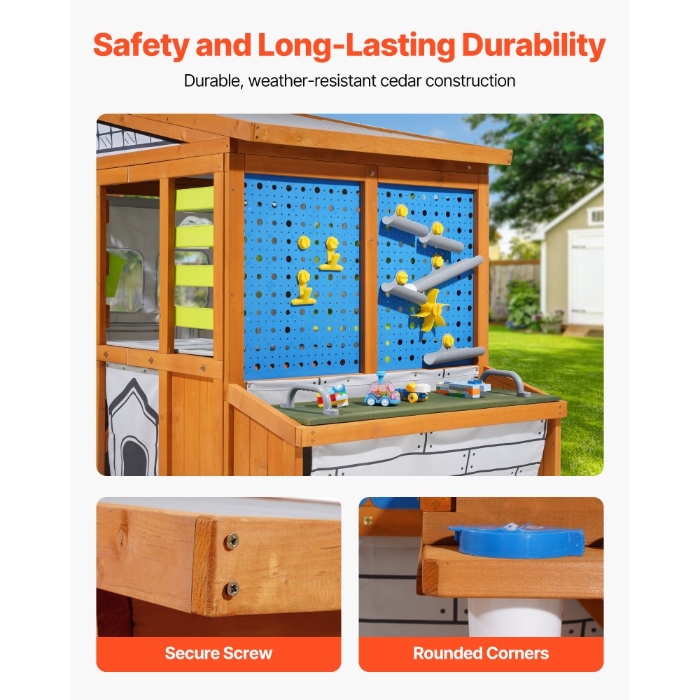 Interior espacioso: La casita de madera tiene capacidad para dos niños. Las puertas y ventanas proporcionan ventilación y una fácil supervisión, mientras que los compartimentos de almacenamiento, las cajas de herramientas y los tableros perforados mantienen los juguetes organizados, fomentando el juego intenso y la exploración creativa