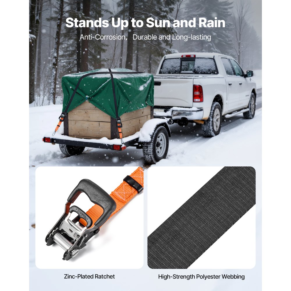 Durabilidad resistente a la corrosión: El trinquete y los herrajes galvanizados se combinan con cintas de poliéster resistentes a la abrasión. Este juego de correas de sujeción de carga resiste el sol, la lluvia y la suciedad de la carretera, garantizando una sujeción fiable y duradera