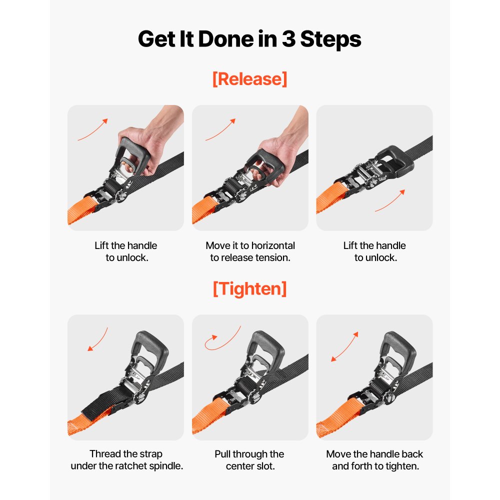 Listo para enganche rápido: Los ganchos de mosquetón de boca ancha se fijan rápidamente a las plataformas de camiones, anillos de remolque, anillas en D y anclajes de cadena. La correa de amarre con trinquete se ajusta firmemente para ayudar a reducir la vibración y el deslizamiento durante las mudanzas y los transportes