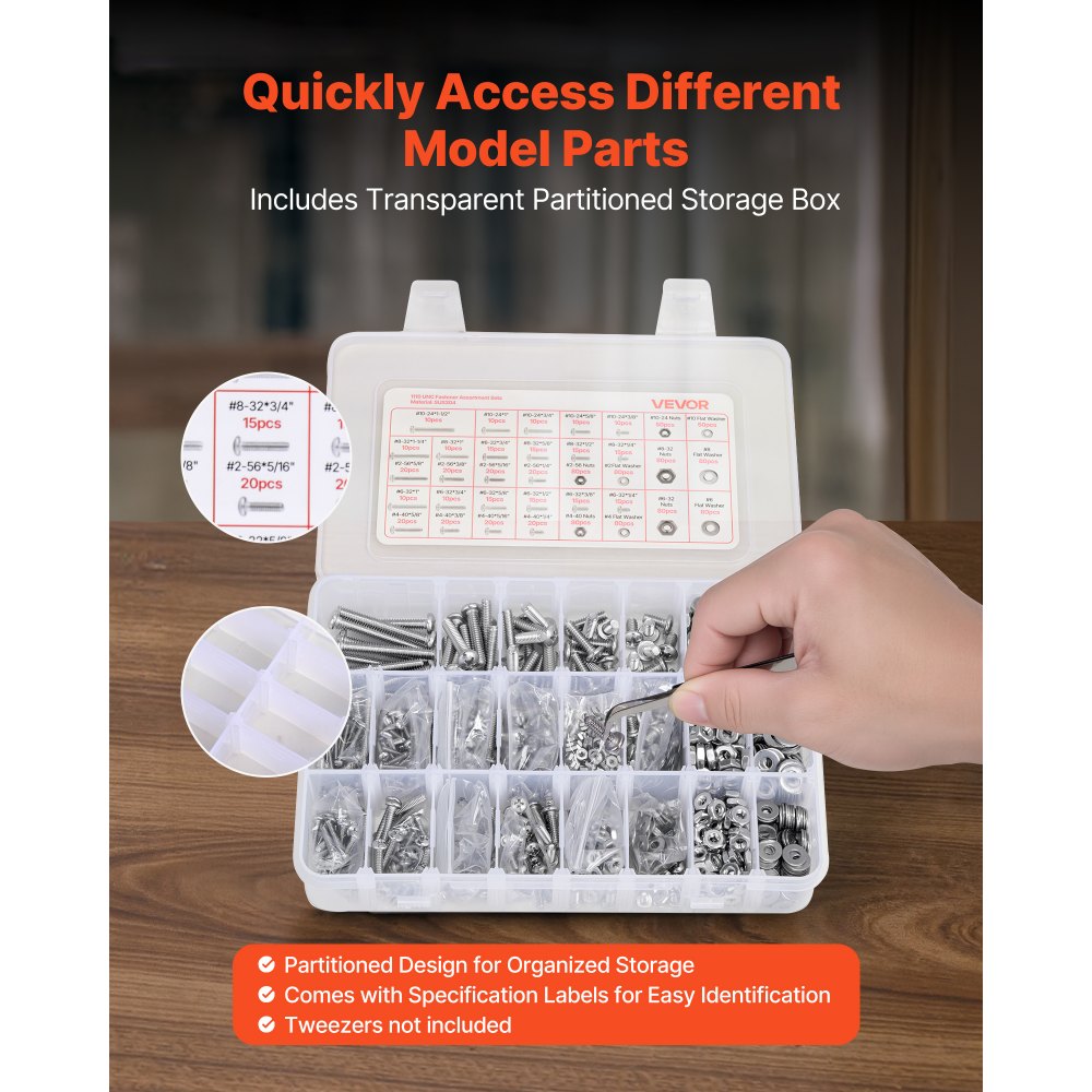 Kit Surtido de 1110 Tornillos y Tuercas, Tornillos de Máquina Imperiales y Arandelas Planas, Acero Inoxidable 10-24, 8-32, 2-56, 6-32, 4-40, para Ensamblaje de Muebles y Vehículos, Plata - Tienda de herramientas